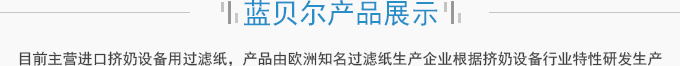 濟(jì)南藍(lán)貝爾工貿(mào)有限公司主要產(chǎn)品擠奶設(shè)備過濾紙,牛奶過濾紙,擠奶機過濾袋,目前主營進(jìn)口擠奶設(shè)備用過濾紙,產(chǎn)品由歐洲知名過濾紙生產(chǎn)企業(yè)根據(jù)擠奶設(shè)備行業(yè)特性研發(fā)生產(chǎn),產(chǎn)品符合歐盟食品接觸標(biāo)準(zhǔn)及FDA食品接觸標(biāo)準(zhǔn),產(chǎn)品在擠奶設(shè)備過濾紙行業(yè)占有70%以上的份額。并通過了SGS標(biāo)準(zhǔn)技術(shù)檢測中心按國標(biāo)食品級標(biāo)準(zhǔn)進(jìn)行的檢測。產(chǎn)品適用于各種擠奶設(shè)備品牌,本公司目前獲得該區(qū)域產(chǎn)品營銷資格。產(chǎn)品已用于國內(nèi)各大乳企所屬牧...